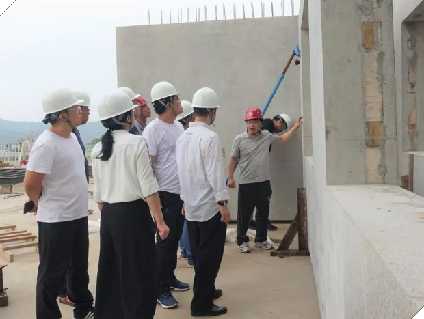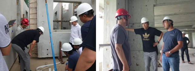 此行重點是觀摩15號樓的施工現場,客人對縱肋疊合剪力墻預制構件設計理念、構件安裝、鋼筋連接、檢驗與驗收等內容進行了詳細咨詢與互動交流,對豎向構件免套筒灌漿連接、預制構件快速安裝施工、以及工程造價優勢有了直觀、切實感受,并對金隅府產品質量以及現場施工質量給予了高度贊揚。