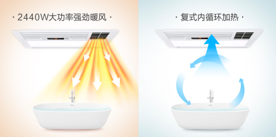 友邦風暖三合一浴霸具有2440瓦的高功率,采用陶瓷PTC加熱技術,通過上下左右復合全方位循環,將舒適的暖空氣高速、快速地輸送到衛生間的各個角落。它不僅驅走了寒冷,還小心翼翼地避免了頭熱腳冷的尷尬。同時,它還具有智能溫度控制和保護功能,可以實時監控室內溫度,成為浴室空間的智能大腦,從而自動降溫和補充溫度。
