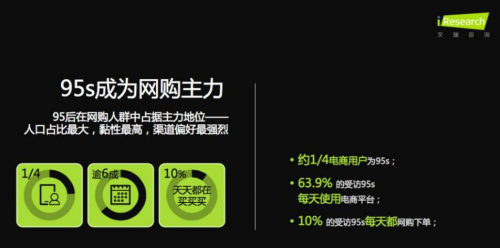 95后年輕人已經成為網上購物的主力軍,大約1/4的電子商務用戶是95后,超過60%的用戶每天都在使用電子商務平臺,網上購物已經融入年輕人的生活。