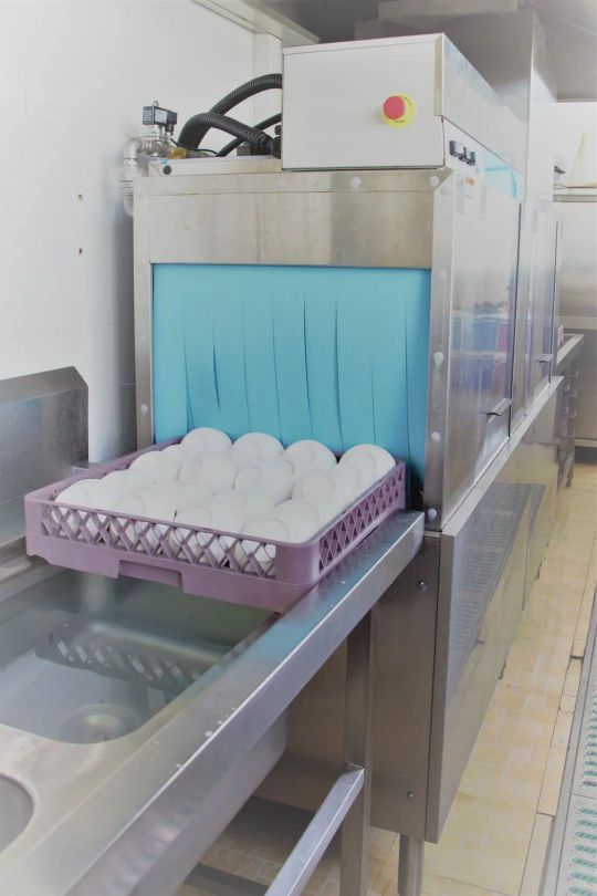 經(jīng)過改造,員工食堂的洗碗間新增了一臺(tái)單噴淋帶烘干的通道式洗碗機(jī)。