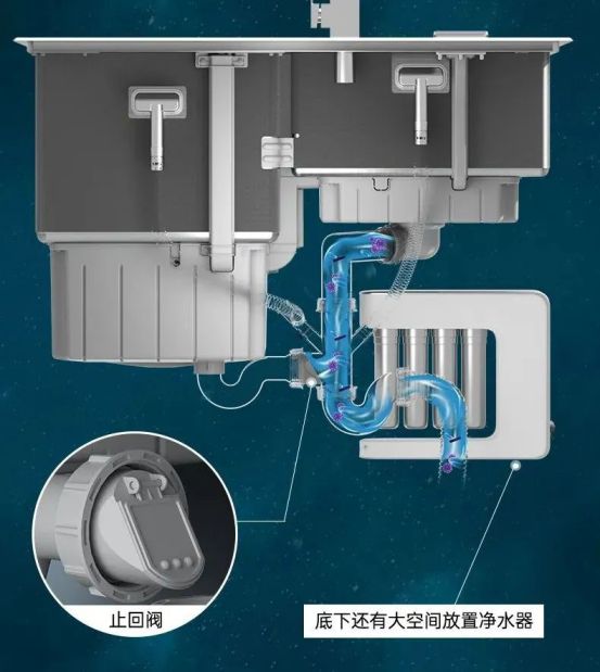 副槽放水時,不會將污水反流到洗碗槽中,且兩個水槽之間的管道不易堵塞。合理化空間設(shè)計,充分釋放廚下空間,用戶可根據(jù)需要自行加裝垃圾處理器和凈水器。