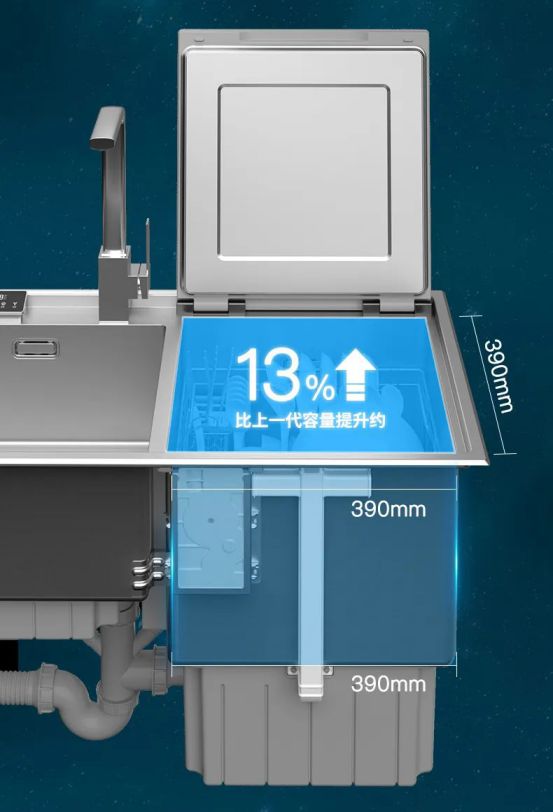 洗碗槽尺寸長寬均增加到390mm,總?cè)萘肯啾壬弦淮嵘s13%!并且水槽寬度也增加到了415mm,充分滿足各種洗刷需求。