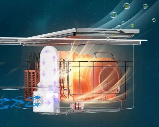 內(nèi)置碟式速熱盤可以將水溫快速加熱至最高75℃,利用巴氏消毒原理,除菌率高達(dá)99.99%;清洗完成后,PTC強排風(fēng)機(jī)帶動高溫?zé)犸L(fēng),經(jīng)由獨特設(shè)計的下沉式風(fēng)道,快速烘干餐具表面水分,防止細(xì)菌滋生;進(jìn)風(fēng)道內(nèi)置UVC深紫外消毒模塊,對進(jìn)入洗碗腔的空氣進(jìn)行消毒,從源頭上杜絕烘干過程中的二次污染風(fēng)險。