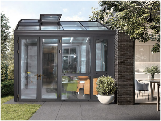 皇庭金門可根據業主不同的需求,提供鋼化、夾膠、中空等各類特種玻璃屋面,鋁合金還可以進行精確地擠壓,為個性化設計提供了無限的可能,有不同的造型和建筑種類的選擇來透露出個性化的特點,在顏色的選擇上更有很大的空間?;释ソ痖T陽光房造型新穎,設計華美,構造安全。