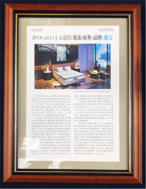 同時,2018年至2019年十大寢具(軟床/床墊)品牌的獲得,也是對穗寶品牌的激勵和鞭策。未來,穗寶品牌將繼續創新,嚴格控制質量,為消費者提供更舒適、更優質的床墊產品。