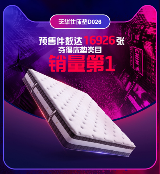 2019年10月21日,雙十一購物狂歡正式開始,在今次天貓的雙十一預售中,芝華仕以極高的性價比推出了乳膠床墊D026,預售的第一天,售出了16,926件,在床墊類中排名第一。