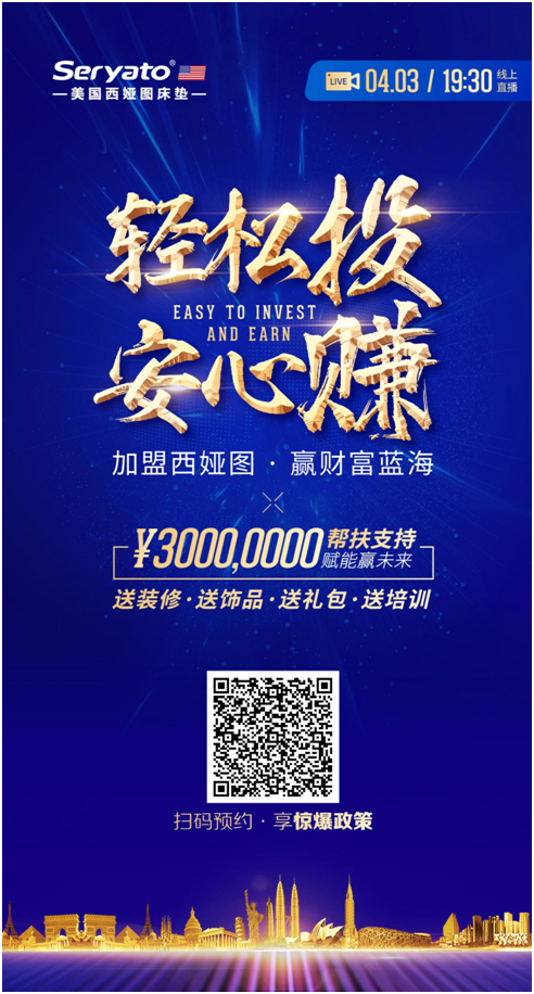 4月3日晚19:30西婭圖將面向全球舉辦“輕松投,安心賺”線上直播招商會,計劃新招募50家有夢想、有格局、敢打敢拼的新晉經銷商,重點幫扶、重點支持、做強再做大!
