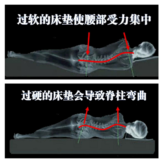 一款過(guò)硬的床墊,肩、臀為主要受力點(diǎn),腰部無(wú)法貼合床墊,使脊椎被迫受力呈彎曲狀態(tài),在睡眠中無(wú)法徹底放松。同時(shí),身體壓力集中在肩、臀部,會(huì)壓迫肌肉和神經(jīng),進(jìn)而影響血液循環(huán),人會(huì)在睡眠中感覺(jué)不適而頻繁的翻身;反之床墊過(guò)軟會(huì)使肩、腰、臀部嚴(yán)重下陷,使脊椎被迫受力呈彎曲狀態(tài)。只有床墊軟硬適中時(shí),均勻分散體重,提供良好支撐,脊椎筆直才能呈現(xiàn)自然的S型曲線。
