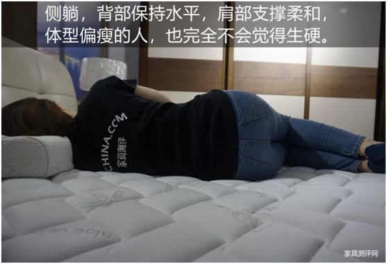 用手撫摸時,觸感柔和,還有點順滑的感覺,直接“裸睡”親和度也足夠。按壓時,床墊的下陷幅度很小。剛開始觸感比較柔和,后面就能感覺到明顯的支撐力。平躺,體型適中的成年女性,整個身體被充分承托。即使臀部這種受力較強的地方,也沒有下墜感。體型偏胖的人,也能被支撐得妥妥的。