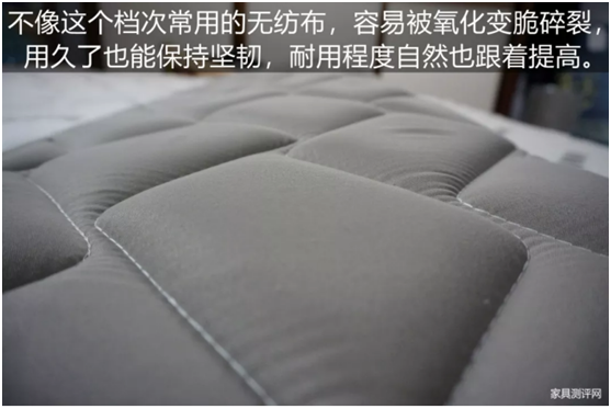 裥花層底部面料用的是觸感非常細膩柔滑的棉布。而且用手拉扯時可以明顯感覺到韌勁十足,無論視覺還是手感都十分高級。不會像這個檔次床墊通常用的無紡布,容易被氧化變脆碎裂,即使用久了也能保持堅韌,耐用程度自然也極大程度的提高。裥花層和舒適層中間也用了一個代替無紡布的東西——康麗萊獨家定制的酷布。拉力非常強大。兩個成年人一起用力撕都難以破壞,用來睡覺就更不用說了。總之一個原則:能用好的就絕不用差的。