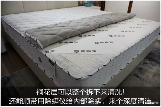 一個讓人很有好感的地方——床墊上層能整個拆下來清洗(建議干洗)。還可以順帶著用除螨儀給床墊內部除除螨,來個深度清潔,從根源上預防細菌和螨蟲的滋生。即使懶得清洗,時不時拆下來拿出去抖抖曬曬也是極好的。更強大的是用久了,還可以再重新定制一個新的裥花層,搖身一變,又是一個新床墊的樣子。