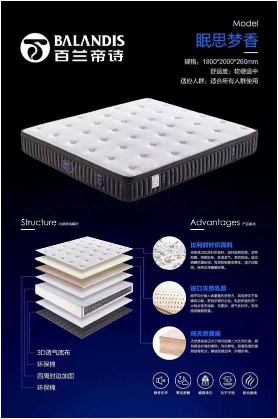 百蘭帝詩(shī)家居是一個(gè)極具創(chuàng)造力和創(chuàng)新能力的企業(yè),創(chuàng)新是深入骨髓的企業(yè)基因,每一個(gè)百蘭帝詩(shī)人都有非常強(qiáng)的創(chuàng)造力和創(chuàng)新力。百蘭帝詩(shī)人非常注重產(chǎn)品的設(shè)計(jì)風(fēng)格、款式及品牌的獨(dú)特性,融合古典與前衛(wèi)、現(xiàn)代與時(shí)尚、生活與情趣,旨在用全新的設(shè)計(jì)思維和以人為本的理念去打造生活的藝術(shù)。2022年,百蘭帝詩(shī)家居推出的眠思?jí)羿l(xiāng)系列,就是針對(duì)深睡眠的5大維度優(yōu)勢(shì)(貼合感、接觸柔軟感、適溫感、干爽感、安全感),精選比利時(shí)針織面料、進(jìn)口天然乳膠、純天然黃麻等原材料制作形成全方位的零感深睡體驗(yàn),倡導(dǎo)人們回歸睡眠本質(zhì),讓身體得到大滿(mǎn)足。