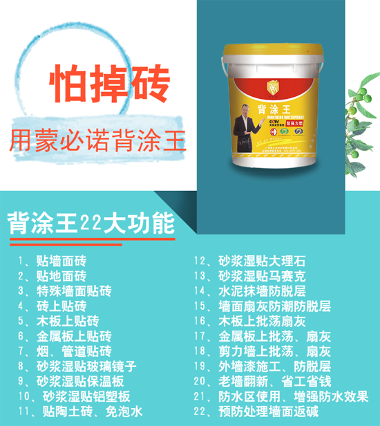 既然瓷磚背膠產品好,那么大伙兒也還是必須注意,現階段瓷磚背膠行業良莠不齊,不少小品牌混淆概念,大多數普通創業者不清楚區分真正的瓷磚背膠!這里,筆者必須指出,想代理瓷磚背膠,可以挑選蒙必諾瓷磚背膠這一個品牌!