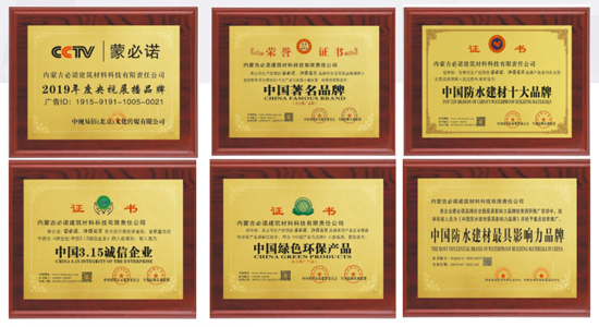 蒙必諾建材自2017年成立至今,經過短短幾年的快速發展,已發展成為一家集研發、生產、銷售于一身的家裝輔材一站式服務體系的企業,其產品通過多項國家權威機構認證,多次榮獲行業大獎。包含《中國著名品牌》,《中國3.15誠信企業》,《中國綠色環保產品》,《AAA級重合同守信用企業》,《中國防水建材十大品牌》、《AAA級招投標企業信用等級證書》《CCTV央視展播品牌》、《中國防水建材最具影響力品牌》等各類獎項。