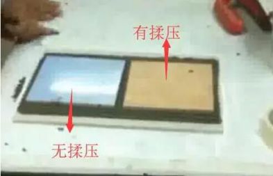左方無揉壓,膠漿分布不勻稱;右方有揉壓,膠漿分布均勻到瓷磚背面,分辨不出原先的齒條形狀且展現倒刺,表明滿漿率更高。