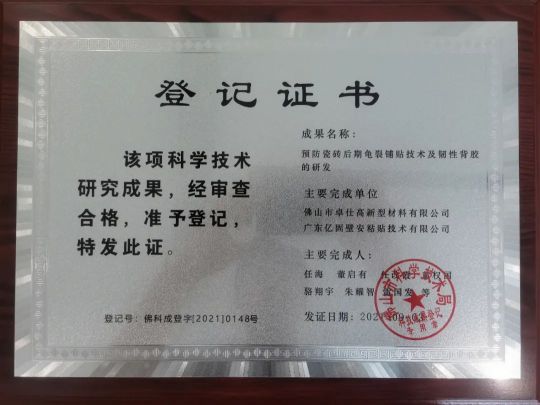 企業一直以來堅持技術創新,推進智能化制造,走高質量發展之路。近年來,與多家科研院校開展產學研合作,科研成果累累。2021年,由佛山市卓仕高新型材料有限公司、廣東億固壁安粘貼技術有限公司聯合承擔的兩項科研成果通過鑒定。