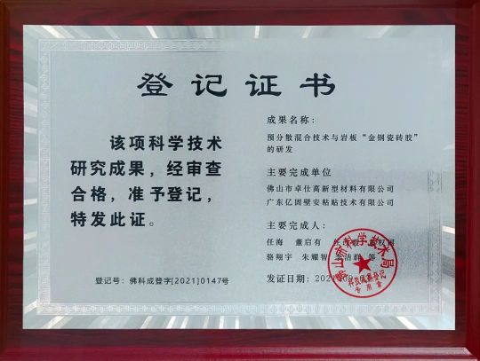其中“預分散混合技術與巖板‘金鋼瓷磚膠’的研發”項目獲得“國際領先”評價;“預防瓷磚后期龜裂鋪貼技術及韌性背膠的研發”項目獲得“國內領先”評價。