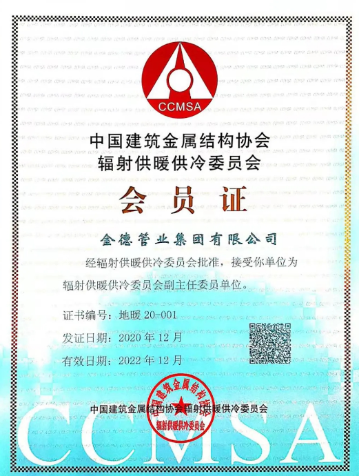 近日,金德管業集團榮獲中國建筑金屬結構協會和輻射供暖供冷委員會會員證并被評為輻射供暖供冷委員會“副主任委員單位”!