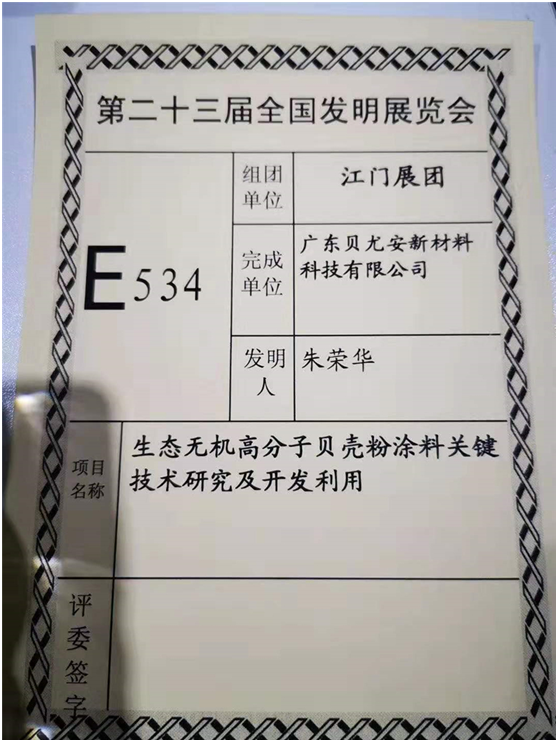 貝尤安“生態無機高分子貝殼粉涂料關鍵技術研究及開發利用”項目榮獲了此次全國發明展覽會的“發明創業獎·項目獎”金獎的殊榮。9日,發明展覽會舉行閉幕式暨頒獎儀式。由于有其他公務安排,董事長朱榮華未能到場領獎,委托公司副總經理林雪明上臺接受此次榮譽。