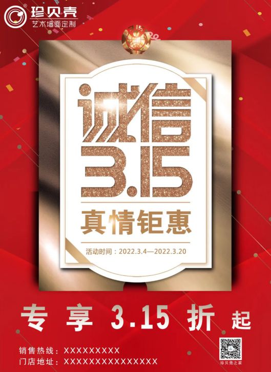 值此3.15來臨之際,珍貝殼公司組織全國百家門店開展“誠信 3.15”為主題的全國聯動活動。本次活動是珍貝殼公司開年的第一場全國性的銷售活動,即是對全國追求高品質藝術涂裝的客戶一次誠意滿滿的回饋,同時也是對珍貝殼藝術壁材全國門店服務品質的一次重要檢驗。