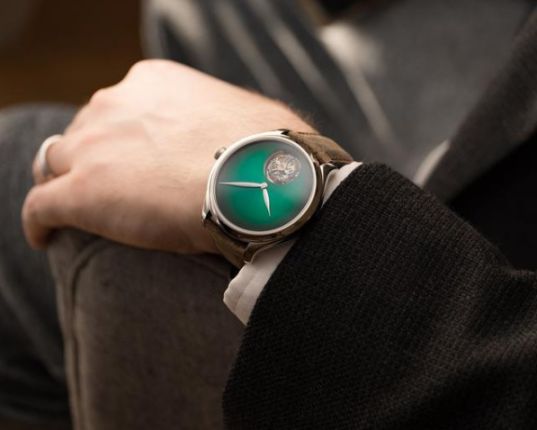 一向擅長(zhǎng)化繁為簡(jiǎn)的H. Moser & Cie.,特別以深邃充滿生機(jī)的宇宙綠太陽(yáng)紋放射狀表盤,來凸顯陀飛輪的時(shí)間精妙,這枚勇創(chuàng)者陀飛輪宇宙綠概念腕表,有著品牌標(biāo)志性的煙熏表盤設(shè)計(jì),整枚腕表上不見任何數(shù)字時(shí)標(biāo)或刻度,僅有葉形時(shí)分針與位于6點(diǎn)鐘位置的陀飛輪,十分洗鏈。除此之外,為了讓它更符合現(xiàn)代使用需求,分鐘陀飛輪更采以獨(dú)立模組化,契合現(xiàn)代潮流趨勢(shì)。