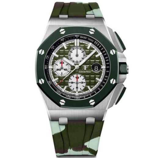 皇家橡樹離岸型系列腕表延續(xù)皇家橡樹系列的經(jīng)典元素——八角形表圈與「Tapisserie」格紋裝飾表盤,并透過加大表徑尺寸、導(dǎo)入橡膠材質(zhì)以及防水性能,都讓這款腕表一推出,便躍升成為奢華運(yùn)動(dòng)表款的新星。今年,Audemars Piguet也推出全新皇家橡樹離岸型系列自動(dòng)上鏈計(jì)時(shí)碼表,除了表面鐫刻「Méga Tapisserie」超大型格紋裝飾圖案之外,更特別以彩色陶瓷打造表圈、按鈕與旋入式表冠,并搭配上同色系迷彩橡膠表帶,再次帶來讓人耳目一新的精彩表款。