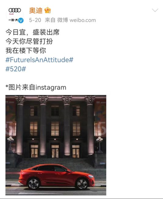 奧迪官博的日常都是“今日宜,XXX”的固定模板。“今日宜,開始充電”、“今日宜,銘記”、“今日宜,看透”……圍繞著這個形式介紹不同產品和品牌活動。