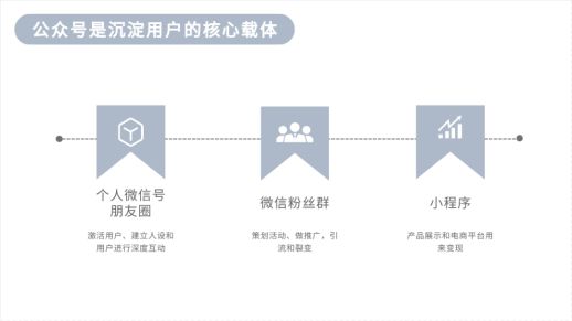 例如,公眾號是沉淀用戶的核心載體;但要激活用戶、建立人設和用戶進行深度互動,則需要借助個人微信號與朋友圈;微信粉絲群用來策劃活動、做推廣,引流和裂變;小程序則作為產品展示和電商平臺用來變現。