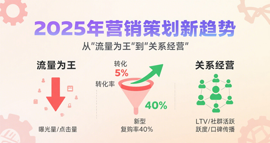 在數(shù)字化浪潮席卷全球的今天,營(yíng)銷領(lǐng)域正經(jīng)歷著一場(chǎng)深刻的變革。2025年,營(yíng)銷策劃正逐步告別過去單純追求流量的時(shí)代,轉(zhuǎn)向更加注重建立和維護(hù)客戶關(guān)系的"關(guān)系經(jīng)營(yíng)"模式。這一轉(zhuǎn)變不僅反映了市場(chǎng)環(huán)境的成熟,也體現(xiàn)了消費(fèi)者需求的升級(jí),更預(yù)示著企業(yè)營(yíng)銷戰(zhàn)略的全面革新。面對(duì)信息飽和的時(shí)代,營(yíng)銷需要從喧囂中找到新的節(jié)奏,重新定義什么是真正的連接和價(jià)值。