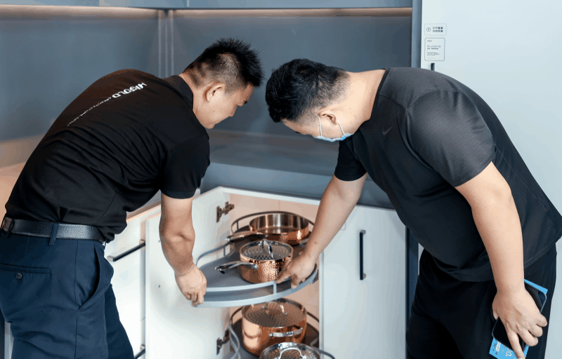 活動當日,悍高總部工作人員和眾多意向客戶紛紛登上集裝箱內,親自體驗來自悍高原創力作的多款功能五金產品,其中包含廚房五金希勒4.0系列、星鏈系列、飛碟3.0系列、希勒太空艙3.0系列、希勒高伸拉籃系列與衣柜功能五金BV系列全套產品,展廳現場絡繹不絕、熱鬧非凡。