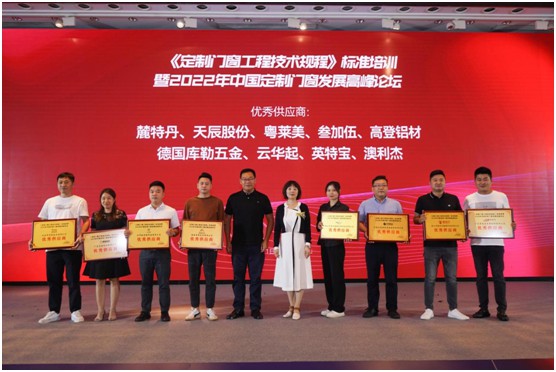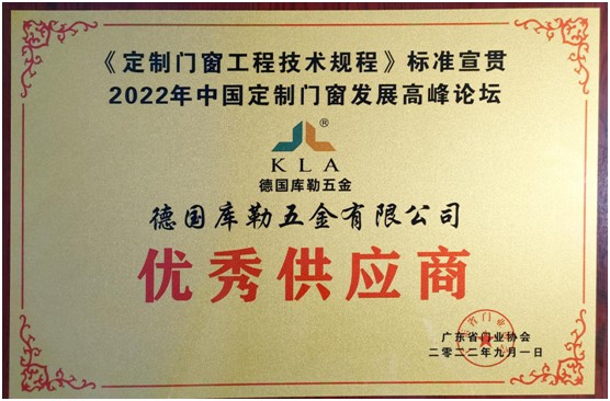 2022年9月1日,“《定制門窗工程技術(shù)規(guī)程》標(biāo)準(zhǔn)培訓(xùn)暨2022年中國定制門窗發(fā)展高峰論壇”在佛山希爾頓酒店隆重舉辦。庫勒五金受邀出席,并在頒獎典禮現(xiàn)場榮獲“優(yōu)秀供應(yīng)商”榮譽!