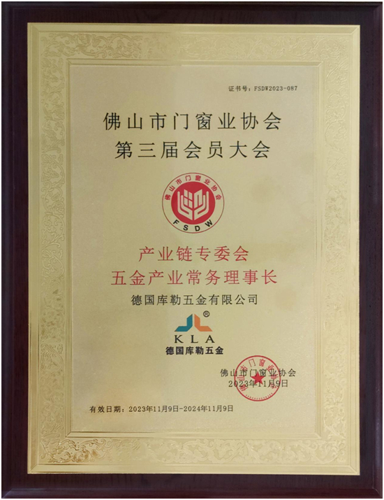 作為佛山市門窗業協會的會員企業,德國庫勒五金始終積極參與到協會的各項活動中,支持并推動協會的發展。此次榮獲“產業鏈專委會常務理事長”稱號,更是表明了庫勒五金在門窗行業內的領導地位和影響力。