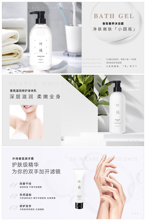 懂得用葉純產品護理的你,永遠最美。夏日炎炎,酷暑將至,葉純沐浴露+身體乳+護手霜套裝,更加呵護女性的美。葉純沐浴露清爽控油,適合夏天使用,清潔角質的同時又能給肌膚提供充足的營養;葉純身體乳+護手霜給皮膚足夠的滋潤,皮膚因為長期坐在空調房容易變得干燥缺水,這時候涂上身體乳或者護手霜,讓肌膚時刻保持滋潤和活力。