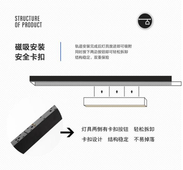在磁吸軌道上,磁吸軌道線條燈光源可以自由移動,并且燈光可以根據(jù)空間要求自由布置。另外,許多電磁光源的角度可調(diào),包括聚光燈,格柵燈等,這增加了照明設(shè)計的自由度。而且安裝簡單,需要預(yù)先鋪設(shè)好軌道,把燈具吸上去就會卡住、按住卡扣按鈕就可以拿下來,一秒搞定。關(guān)鍵是穩(wěn)固,不用擔(dān)心磁吸力不夠,會掉下來。