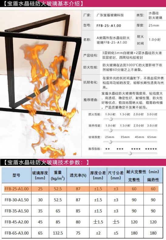 25mm水晶硅防火玻璃的防火性能:防火玻璃在達到1000℃的火苗影響下依然能夠60分鐘之上不崩裂。