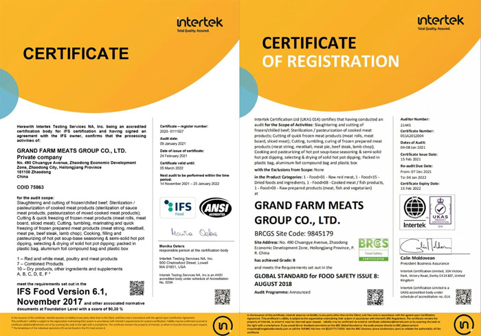 2021年2月25日,大莊園順利通過BRCGS(食品安全全球標準)、IFS(國際食品標準)兩大國際食品標準認證,成為國內畜類及牛羊肉行業第一家通過歐洲國際雙體系質量認證的企業。