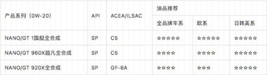 1.NANO/GT 1 C5/SP 0W-20 旗艦級全合成機油; 2.NANO/GT 960X C5/SP 0W-20 超凡全合成機油; 3.NANO/GT 920X SP GF-6A 0W-20 全合成機油;