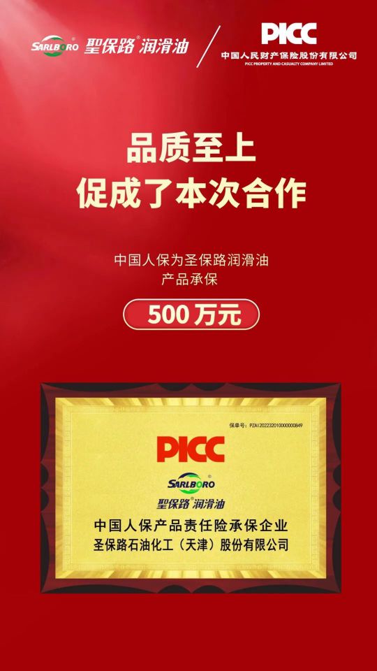 客戶為先,品質至上。為了讓消費者購買無憂,進一步完善圣保路產品售后維保服務體系、增強圣保路品牌價值,此次圣保路潤滑油與中國人民保險(PICC)簽訂了產品承保協議。合作約定,在此期間,消費者凡購買圣保路正品,如遇產品原因造成的損失均可要求索賠,單品保額為500萬元。