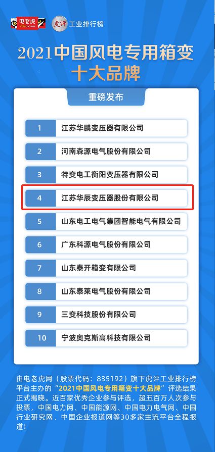 這份排行榜是用戶與媒體共同得出的結果,華辰變壓器的排名表明了其近階段來深耕新能源領域,厚積薄發,獲得了市場的廣泛認可!同時也更加堅定了華辰在新能源領域中披荊向前的信心!