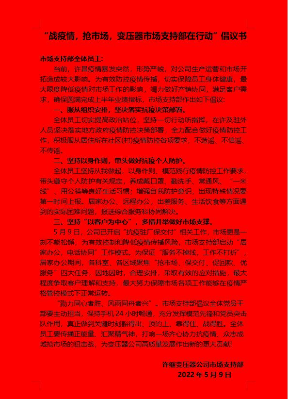 此次疫情,使整個城市再度靜默,但是,時間不會按下暫停,變壓器公司重點合同的履約交付迫在眉睫,焦灼的心情在變壓器公司每一位共產黨員突擊隊員和每一位疫線的員工心中蒸騰,他們,義無反顧的踏上了逆行之路,與時間賽跑,頑強作戰,不怕疲勞,沖鋒在前,在保證自身安全的前提下,高標準、高質量地開展工作。截至5月10日,已累計完成4個項目10臺(套)產品的生產裝配,有2個項目4臺(套)產品已經完成發運工作,有效保障了4項重點工程建設。