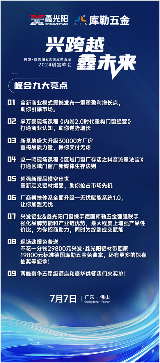 在門窗行業(yè)風起云涌的今天,如何抓住機遇,實現(xiàn)跨越式發(fā)展?7月6-7日,庫勒五金攜手興發(fā)·鑫光陽門窗,共同舉辦“興跨越·鑫未來”財富峰會,為門窗行業(yè)注入新的活力與機遇。