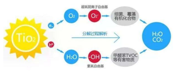 光觸媒事實上是某種納米級的金屬氧化物材料(當中涂料產品用的較多也最常見的便是二氧化鈦)。二氧化鈦它極強的氧化功能是現階段光觸媒中最優秀的,它能在光的效果下,在表層釋放活性極強的空穴/電子對,可以有效的和空氣中的有機物質還有各類細菌、霉菌發生降解反應,進而做到凈化空氣、抗菌抗菌等功能;