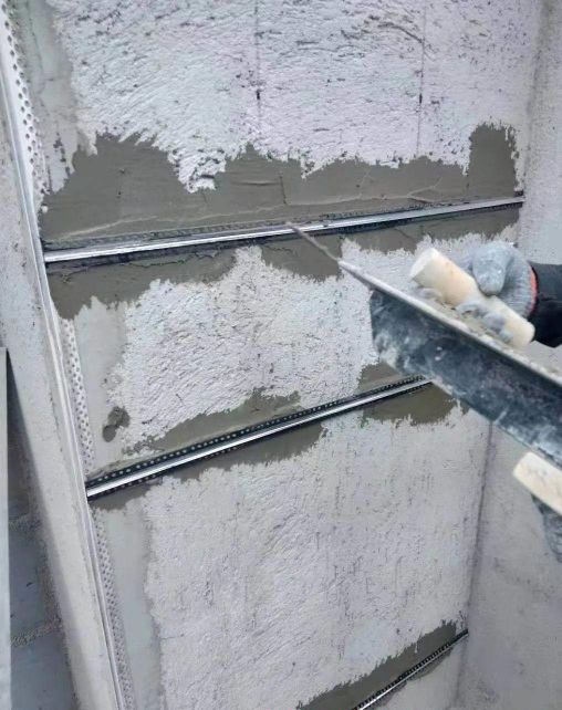 固定好分隔條之后,批刮第二遍外墻抗裂砂漿,干燥后再批刮外墻專用細(xì)膩?zhàn)?找平),厚度需與線條齊高。