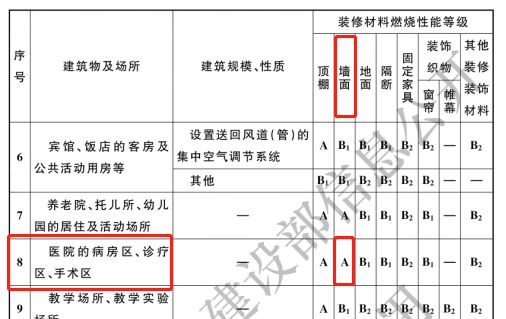 《建筑內部裝修設計防火規范》明確規定,醫院病房區、手術區、診療區墻面裝修材料必須采用A級防火材料。