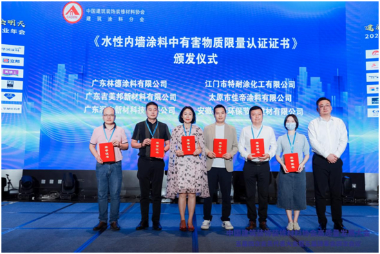 年會上的榮譽時刻,林德漆再次成為焦點。在《水性內墻涂料中有害物質限量認證證書》的頒獎儀式上,林德漆憑借其出色的產品質量和環保性能,成功斬獲這一殊榮。這不僅是對林德漆長期以來堅持綠色環保、質量至上的生產理念的肯定,也是對其在行業內領先地位的認可。