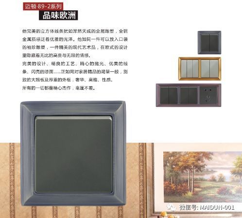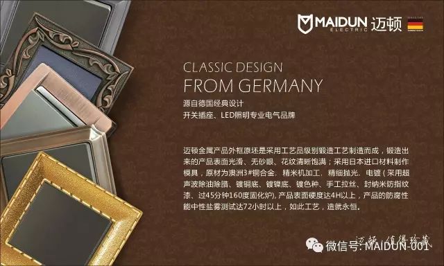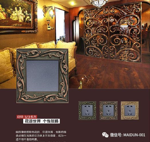 邁頓全銅開關在產品紋路上有采用中式方柱,歐式羅馬柱,法式雕花等等元素,通過完美的設計,優美的線條,精良的制作工藝,以及精細的考究,使得成品彰顯貴族風格,高貴典雅。追求簡潔自然之美的同時保留了各自文化的線條輪廓特征,在風格呈現各自風格的文化底蘊;在細節上,也強調開關的舒適度和時代感。