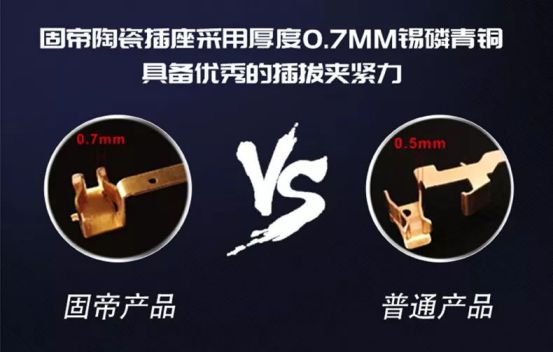 固帝堅(jiān)持高品質(zhì)開關(guān)定位,一方面從用電安全角度出發(fā),改進(jìn)插座用材,精選防火耐高溫的陶瓷組件作為后座材料包裹導(dǎo)電銅件,相比傳統(tǒng)材料,具備更好的絕緣性和耐高溫能力;另一方面,固帝陶瓷插座采用0.7MM超厚特制錫磷青銅件,相比市面上的普通插座,能承載更大功率電流,且具備優(yōu)秀的插拔夾緊力,長(zhǎng)久使用不易掉插頭。