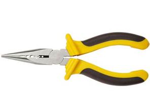 尖嘴鉗有鉗頭和鉗柄及鉗柄上耐壓為 500 v 的絕緣套等部分,尖嘴鉗的功能:尖嘴頭部細長成圓錐形,接近端部的鉗口上有一段棱形齒紋,由于它的頭部尖而長,因而適應在較窄小的工作環境中夾持輕巧的工件或線材,或剪切彎曲細導線。