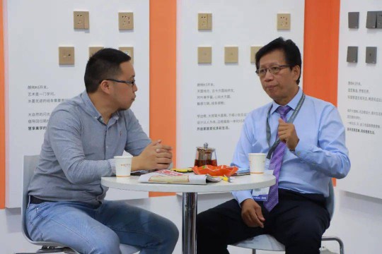 △大照明全平臺執行總裁唐斌(左)對話朗能電器董事長鄧超華(右)。