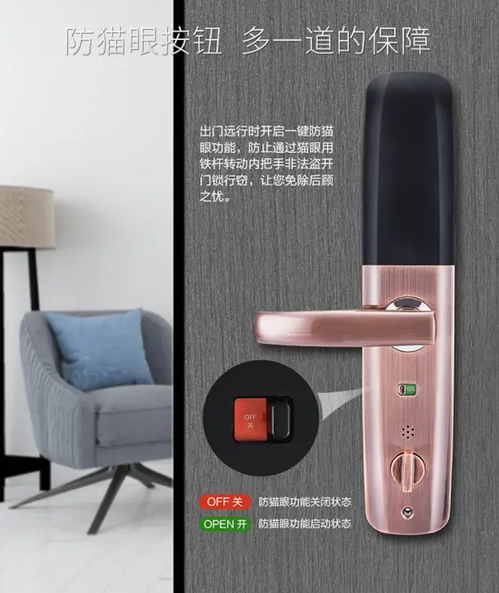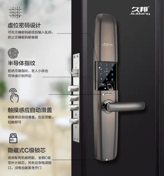 此外,在互聯網技術和人工智能潮流的推動下,久邦重新定義了家庭智能鎖,這是技術創新的加持。語音導航功能,方便老人和兒童使用;手機利用遙控開鎖,你不必急著開門,可以在房間里控制開鎖;防貓眼開啟設計,下壓執手才能開門,有效預防不法分子利用貓眼用鐵桿轉動非法開啟。此外,還配備了低電警報、記錄查詢、虛偽密碼等新功能,重新定義了智能鎖的視野,讓用戶享受舒適安全的智能家居體驗。
